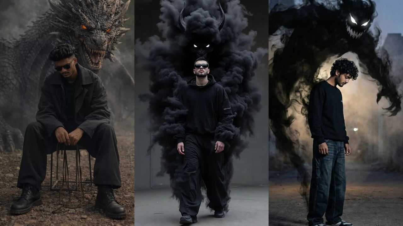 Prompt – Subject) Photorealistic portrait of a young man(keep the facial features unchanged as uploaded image), exact facial identity preserved, beard, sharp jawline. (Outfit) Wearing all-black streetwear, black oversized hoodie with minimal text, loose black wide-leg pants, dark sneakers, luxury black sunglasses.Pose) Head raised straight, dominant stance, shoulders squared, one hand relaxed near pocket, other hand slightly clenched, facing forward. (Supernatural Element) A massive black smoke demon