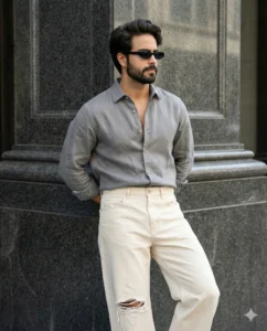 Prompt – Do not alter, beautify, idealize, or stylize the face in any way. The face must remain fully authentic, realistic, and unchanged. Creats A full-body shot of a young boy with same hair , stylish volume hair, neat beard, leaning against a dark grey fancy pillar. He is looking away from the camera in a relaxed, gentle pose, with one hand back. He is wearing small, sleek black sunglasses. Outfit Details.